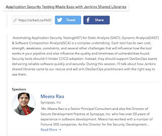 Long story short, the topic I am speaking is "Application Security Testing Made Easy with Jenkins Shared Libraries" October 24th 2018.